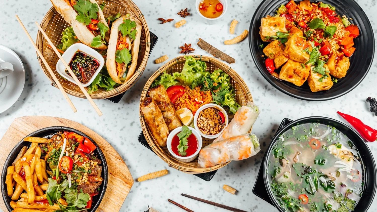 🧭 Ho Chi Minh City / South: A sweeter palate overall with larger DIY condiment sets and more abundant toppings. Street-snack culture thrives around mealtime. Anchor dish: Cơm tấm — broken rice with grilled pork chop, egg, pickles, scallion oil, and sweet-savory fish sauce.